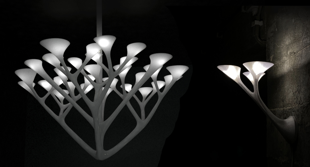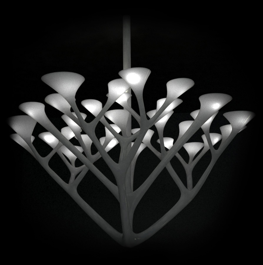 3D printing is ideally suited to producing objects with an organic design, since you can 3D print almost anything. We love the natural world with all its tiny variations in shape or form: a rose bush has many flowers, but each is unique. This is reflected in our designs, too, especially the new Oyster chandelier.